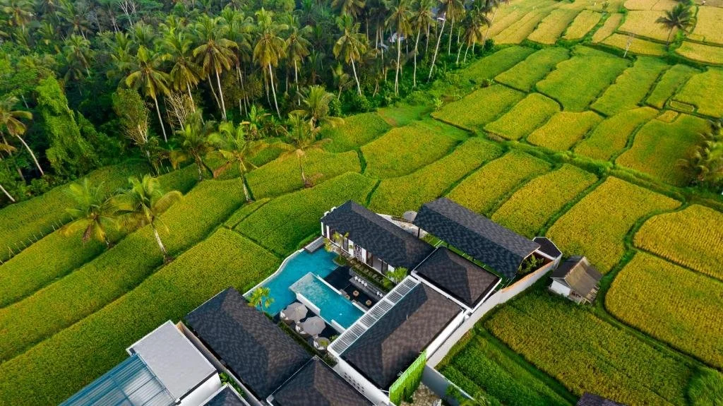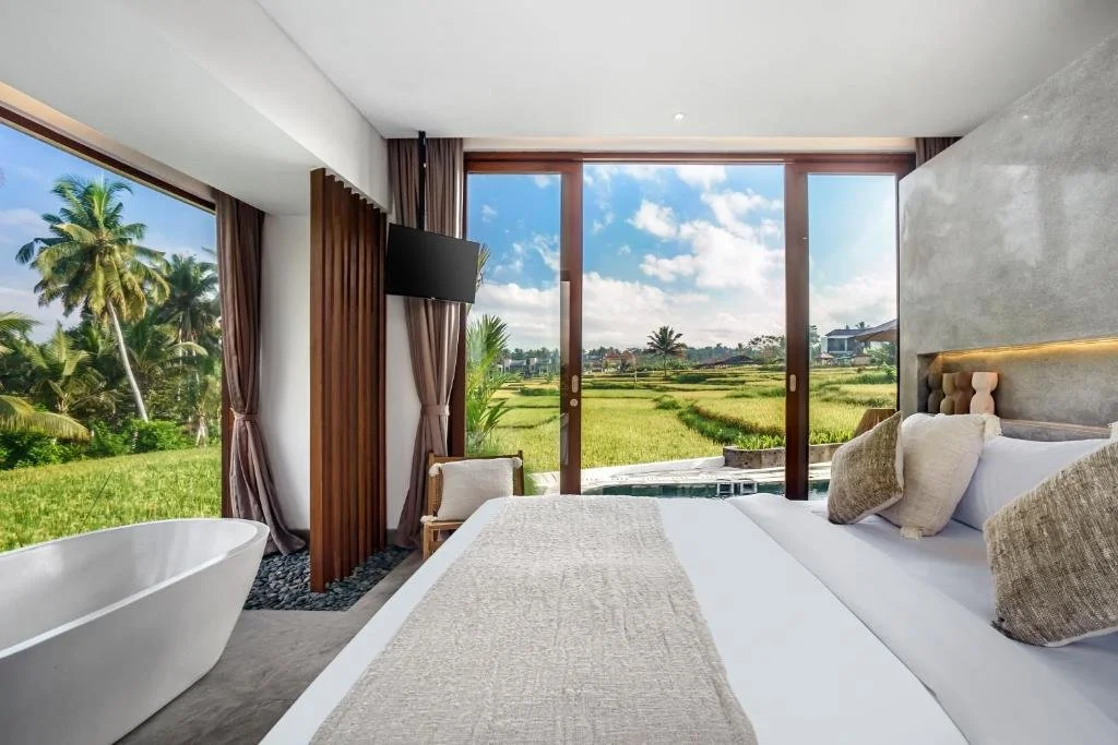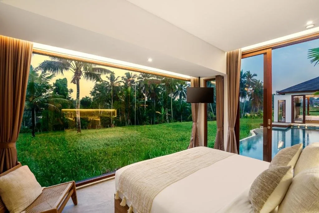 Expansive open-plan living areas with breathtaking views of the jungle and rice paddies